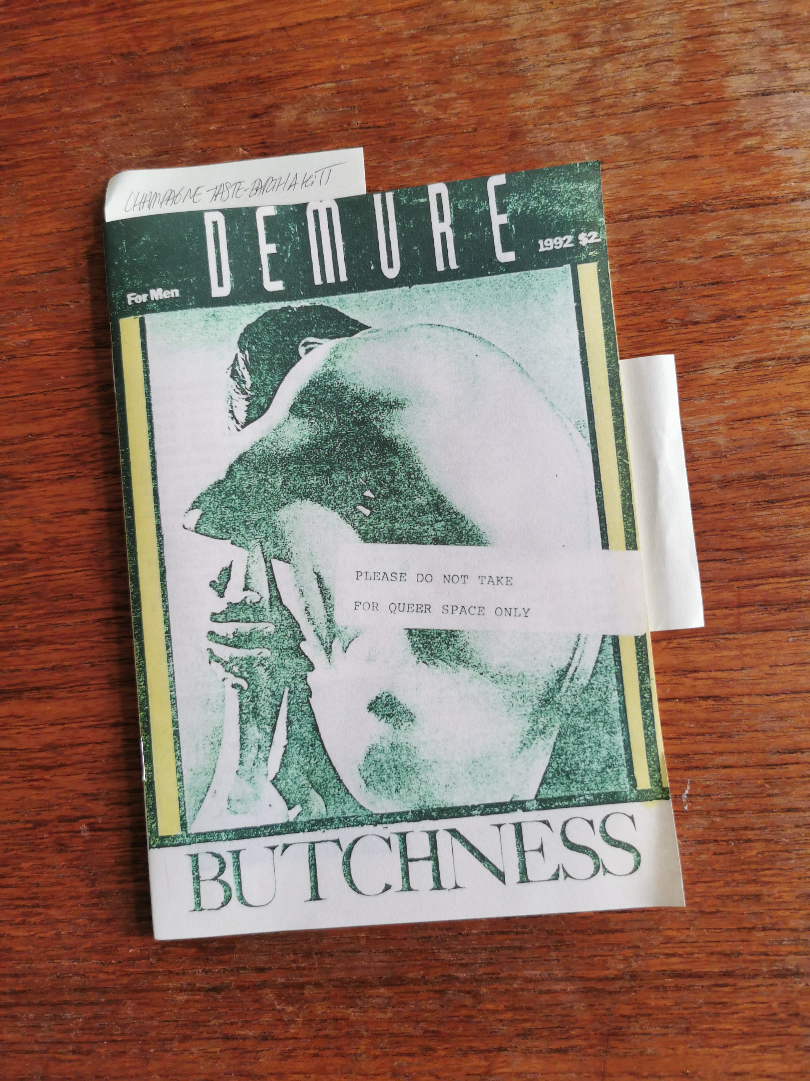 Demure Butchness was a magazine for men published in 1992 in the US featuring a queer quiz titled “Are you a fag?”, lists of cool and hot people, a beautiful Madonna collage as well as a review of a drag happening at the Casablanca Show Lounge in Minneapolis where a drag queen lip-synced to Eartha Kitt’s iconic “Champagne Taste”.